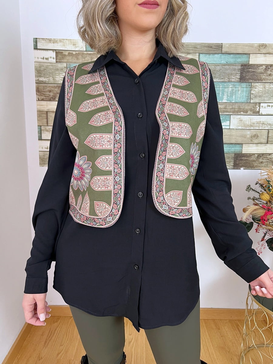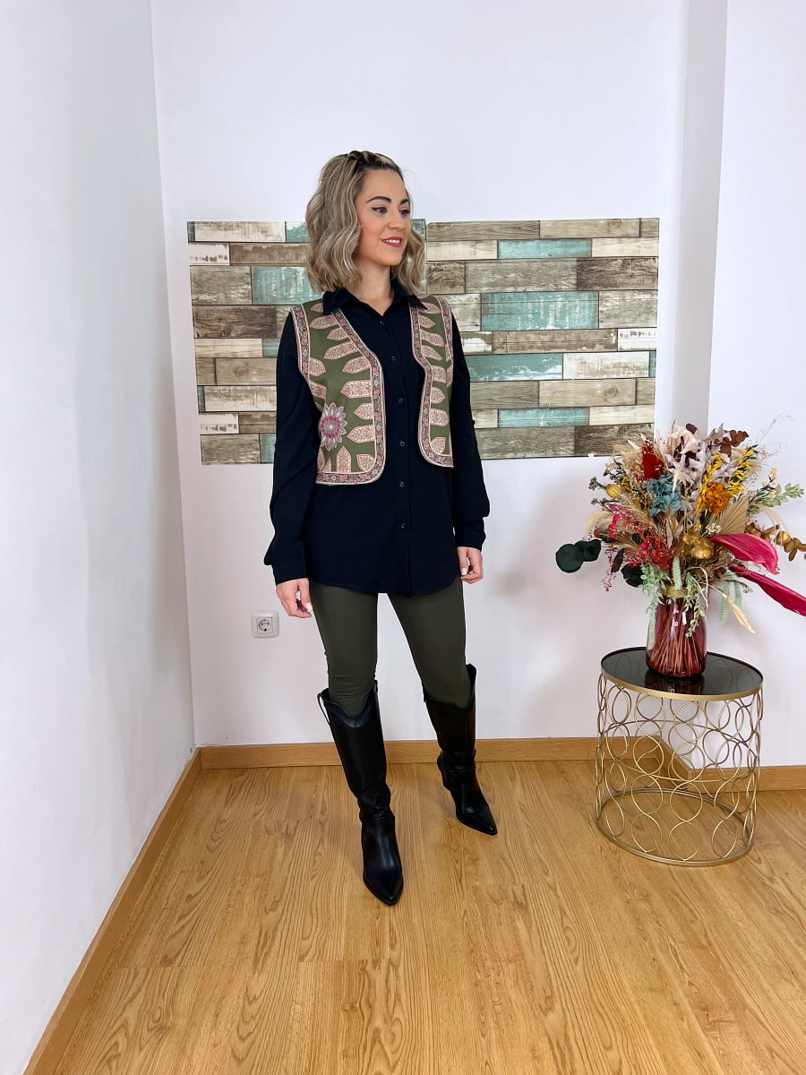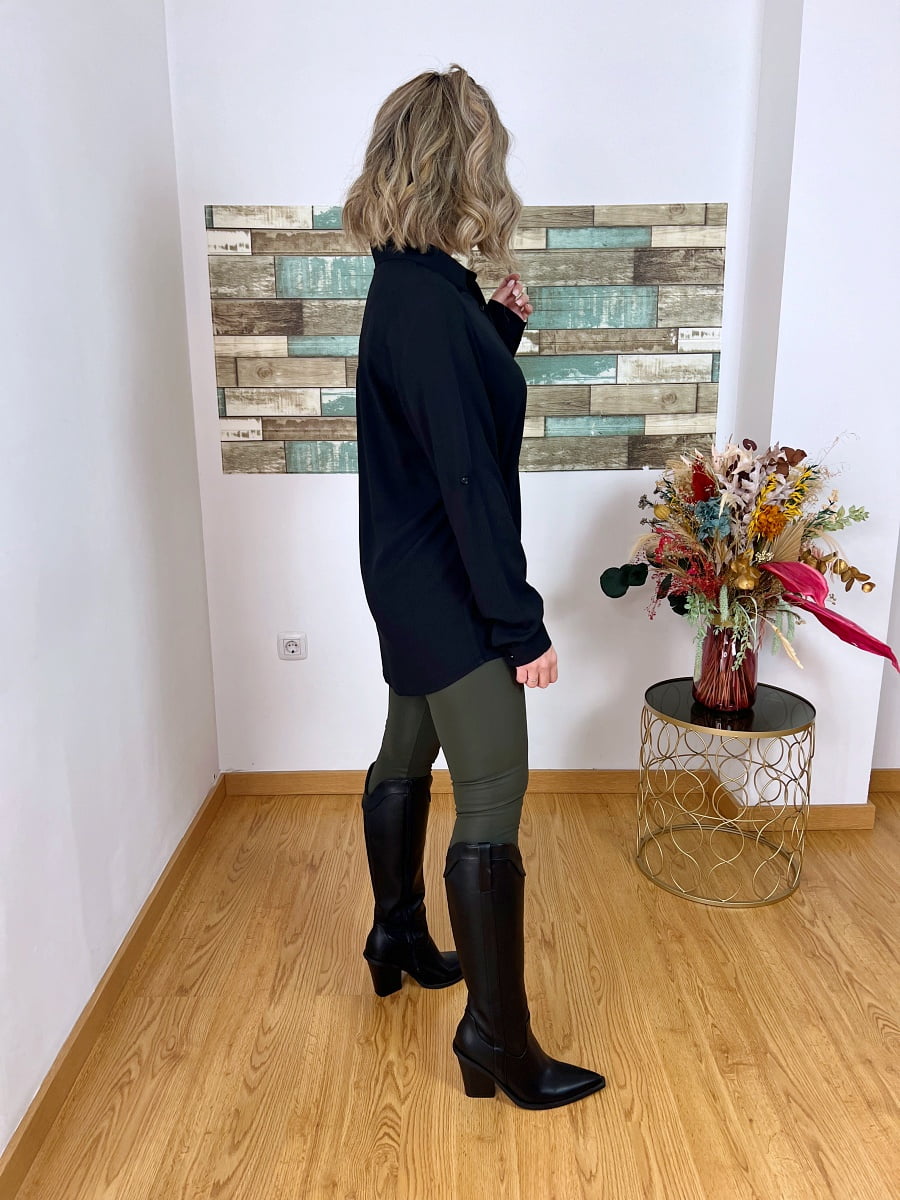 Es una camisa de mangas largas, abotonada, botón en los puños y codos. 100% Viscosa