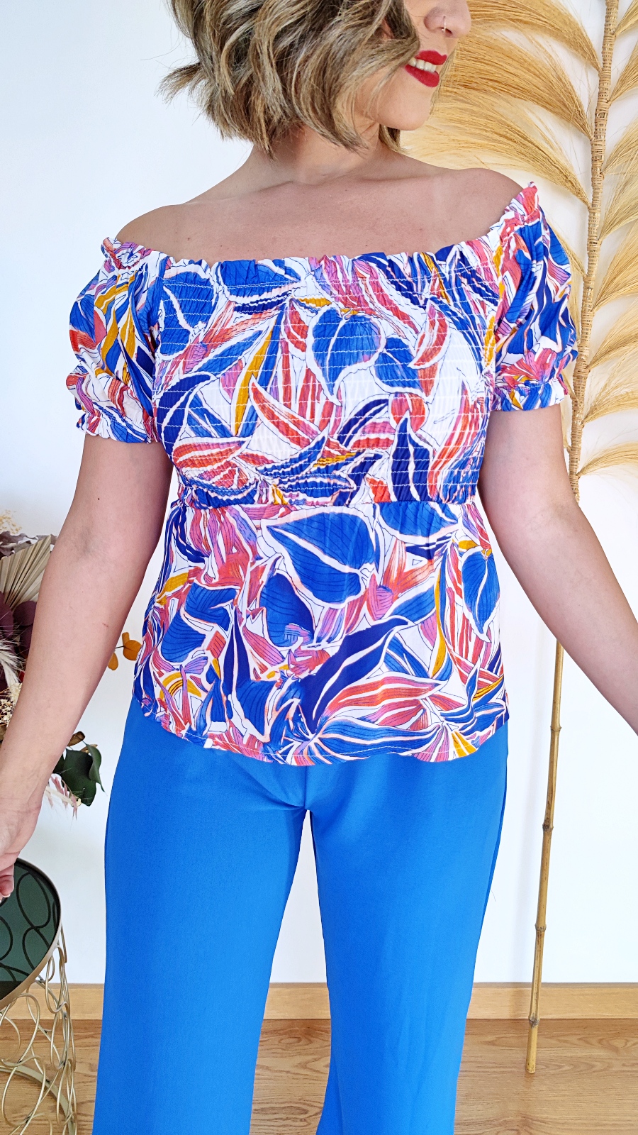 Camiseta Tropical es un top con tejido fluido estampado, nido de abeja en pecho y espalda, goma elástica en cuello y mangas. 100% Viscosa.