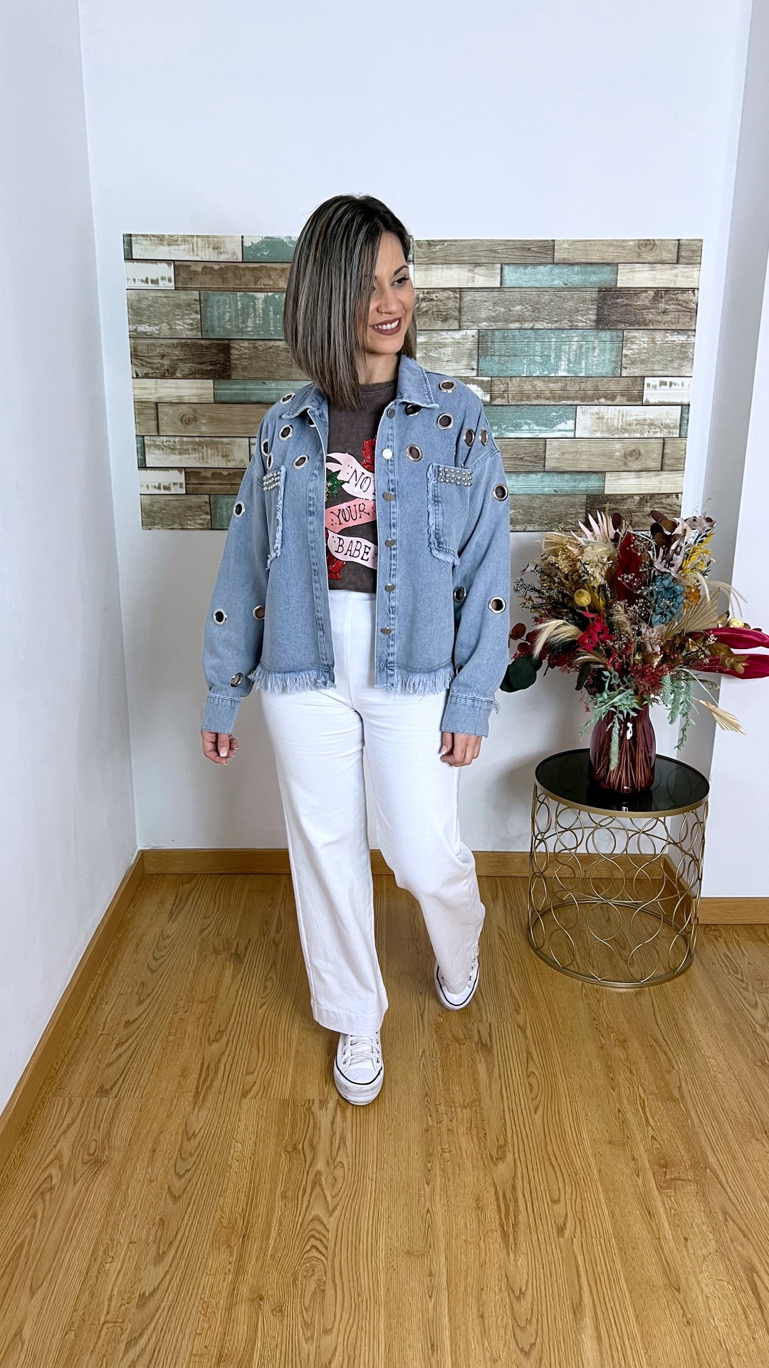 Esta chaqueta vaquera abotonada es el complemento perfecto para cualquier outfit casual. Los detalles de tachuelas en los bolsillos delanteros, así como los agujeros metálicos en el pecho y las mangas, le dan un toque de estilo original y auténtico. La chaqueta también cuenta con un diseño desflecado en mangas, espalda y bajos, creando una apariencia desenfadada y moderna. Fabricada con 90% de algodón y un 10% de poliéster.