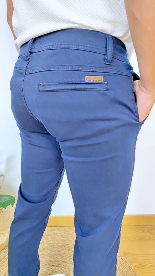 Pantalon Chino Marino es un pantalon confeccionado en tejido de algodón con elasticidad, bolsillos frontales y detalle de bolsillo en espalda. Cierre frontal con cremallera y botón.