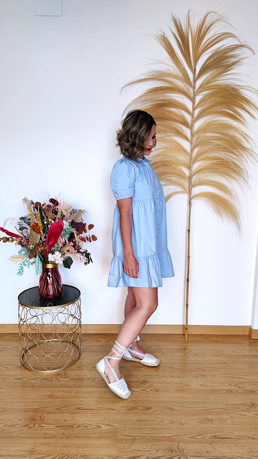 Vestido Celeste es un vestido camisero abotonado de mangas cortas con goma en la parte de las mangas y terminación avolantada. 100% Algodón.